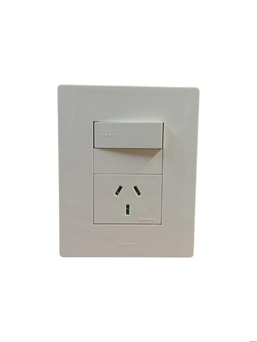 LLAVE ARMADA 1 TECLA SIMPLE + TOMA 10A BLANCO BAUHAUS + TAPA ARTE BLANCO DISTANCIADOR GRIS